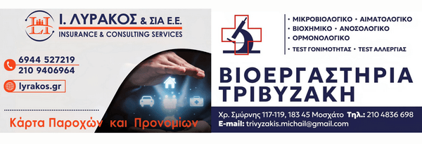 Το ασφαλιστικό γραφείο Ι. Λυράκος & ΣΙΑ Ε.Ε. ανακοινώνει την συνεργασία με τα ΒΙΟΕΡΓΑΣΤΗΡΙΑ ΤΡΙΒΥΖΑΚΗ, ένα από τα κορυφαία διαγνωστικά κέντρα στην ευρύτερη περιοχή. Η συνεργασία αυτή έχει ως κύριο στόχο την αναβάθμιση των παρεχόμενων υπηρεσιών προς τους πελάτες του γραφείου, προσφέροντας αποκλειστικά προνόμια.